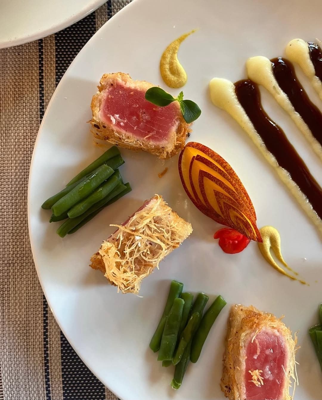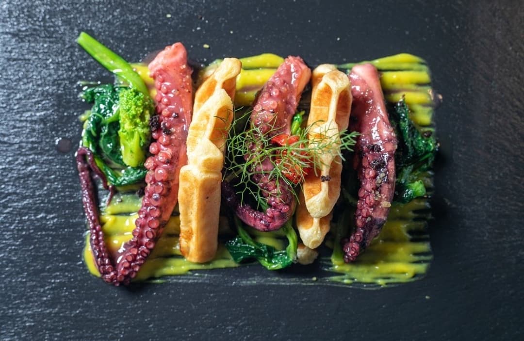 La cucina a vista è il cuore pulsante di Yellow Scapece: qui lo chef Demis Pastore trasforma pesce freschissimo e ingredienti locali in piatti che sorprendono per estetica e sapore. Tra i protagonisti del menu spiccano il gambero viola di Gallipoli, i crudi di mare serviti come tavolozze di colori e sapori, e primi piatti di pasta fresca realizzata in casa. Ogni portata racconta il territorio, con accostamenti creativi e impiattamenti curati nei minimi dettagli.